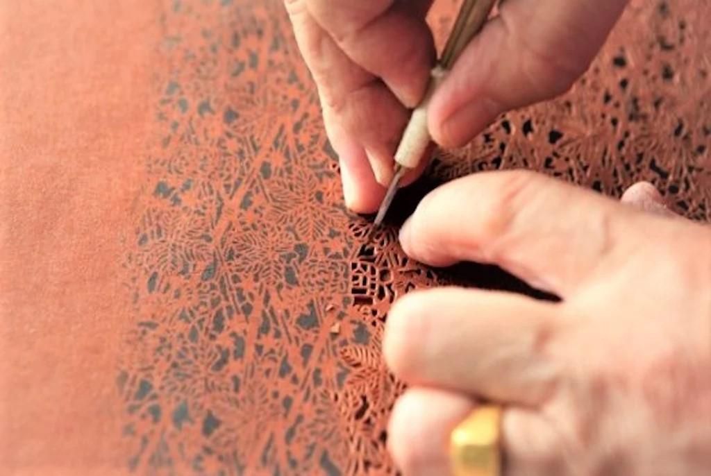 伊勢型紙とは着物の生地に柄や文様を染めるために使用される染色用の型紙です。三重県鈴鹿市の白子・寺家を中心にして千年余りにわたり栄えてきました。 和紙3枚を柿渋で張り合わせて、加工した型地紙を熟練した職人がその技術力と集中力によって手作業で文様を彫り抜いて作られます。